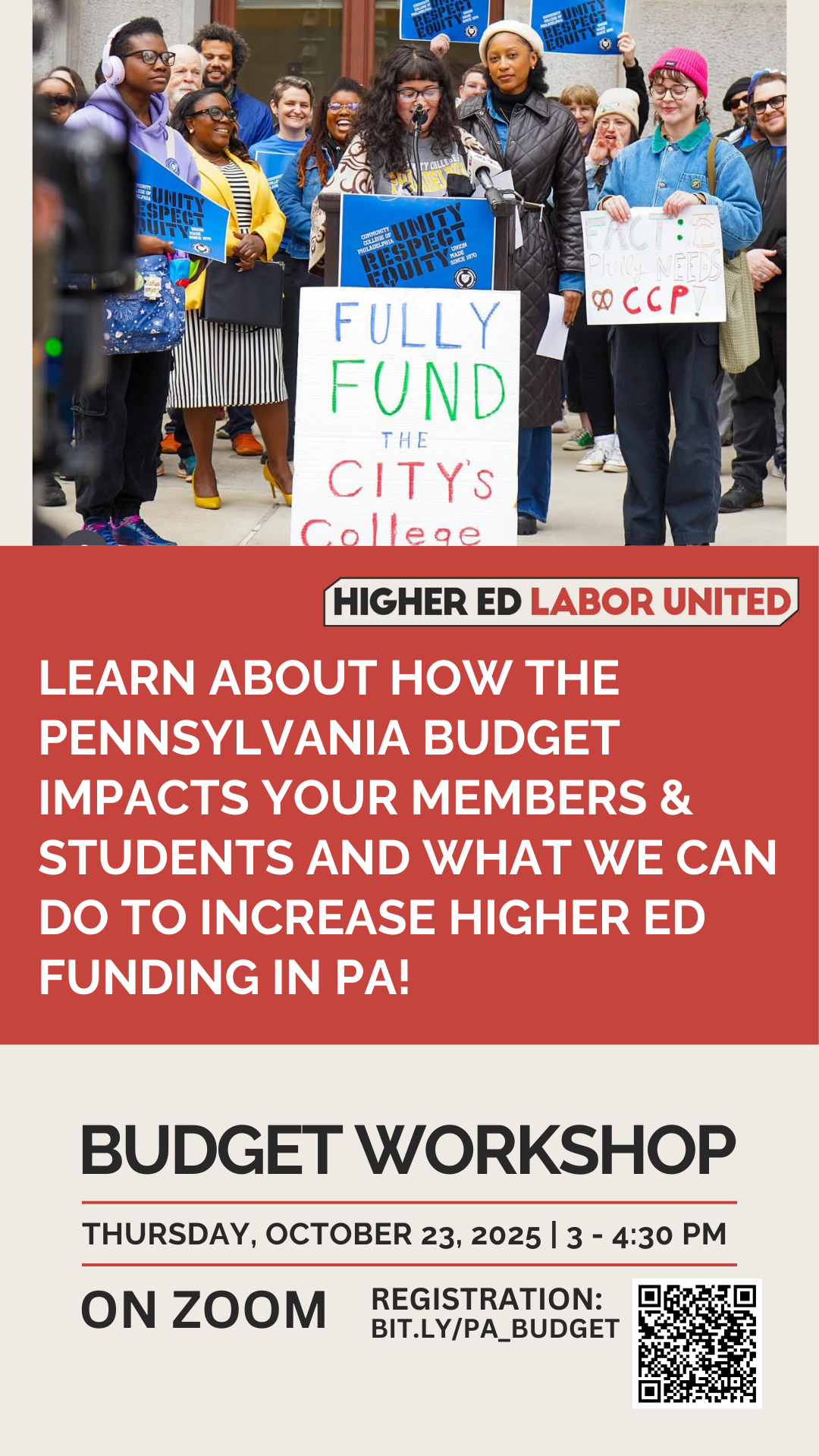 Log on for this training to learn about how the Pennsylvania budget impacts your members and students and what needs to be done to bring PA from the bottom 10 to the top 10 in public higher education funding. Members of public higher ed unions from any union are encouraged to attend, including AFT, AAUP, PSEA, APSCUF, USW, SEIU, UAW, AFSCME, and more!