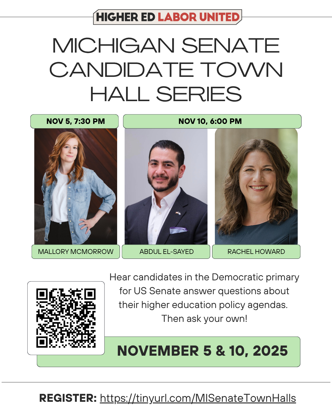 Higher Ed Labor United invites you and your members to join the Michigan Senate Candidate Town Hall Series, featuring Democratic candidates discussing their higher education policy agendas and fielding questions directly from faculty, staff, and students.
