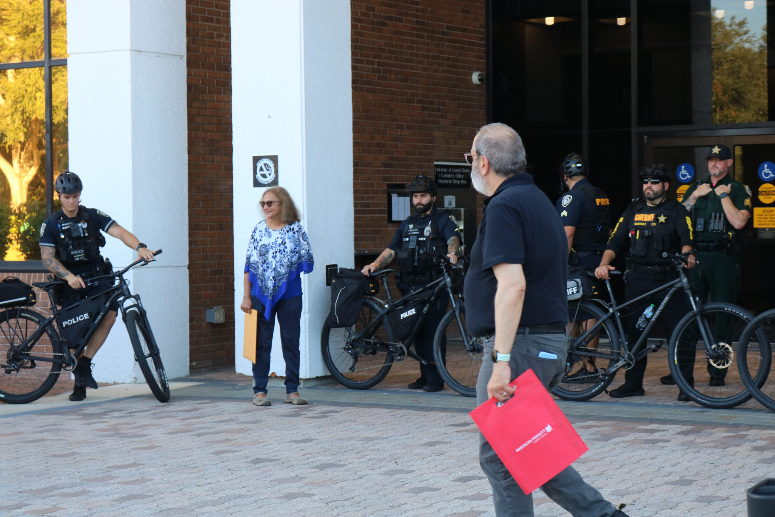 From the onset of the rally, dozens of police officers gathered around the protest. While they claim it was to protect the students from counter protestors, there were only about 10 counter protestors. The students marched from Memory Mall to the main administrative building, Millican Hall, where the protesting students and faculty were met with UCF PD officers blocking the entrance to the building, preventing the protestors from entering the building and forcing us to deliver our demands to a lone member of administration waiting outside.