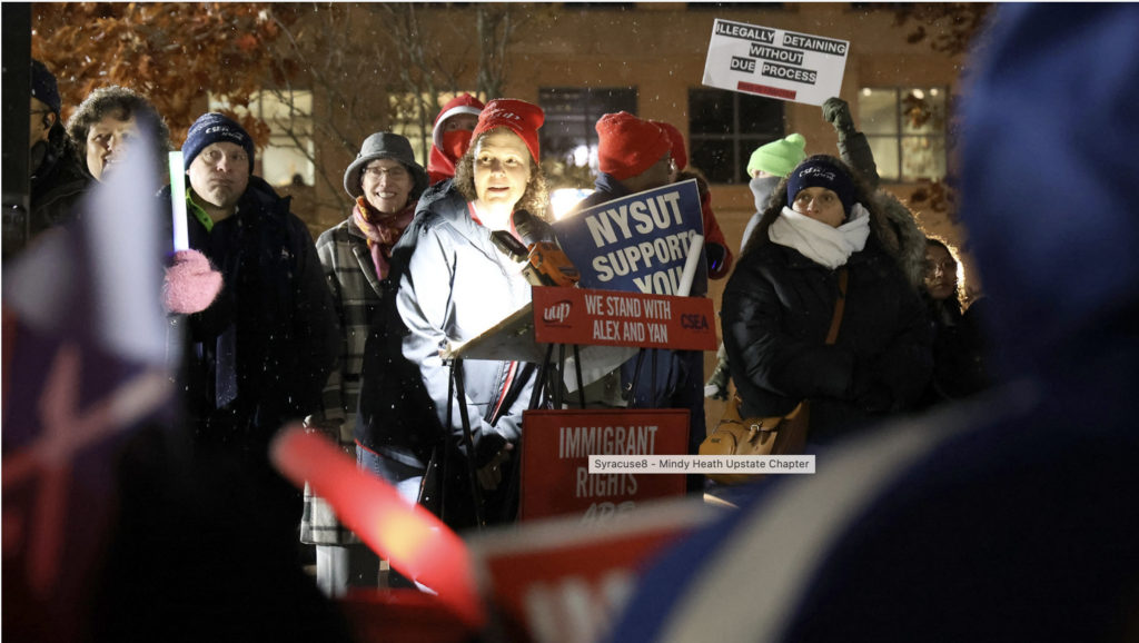 Mindy Heath, UUP Upstate Chapter President, spoke powerfully about what this means for union members. Alex and Yan are part of our union family, she said. “They show up every day to care for others in one of the most demanding healthcare environments in the state. To have them taken like this, without warning and without justice, is heartbreaking and unacceptable. UUP will keep fighting until they are both home, safe, and free.”